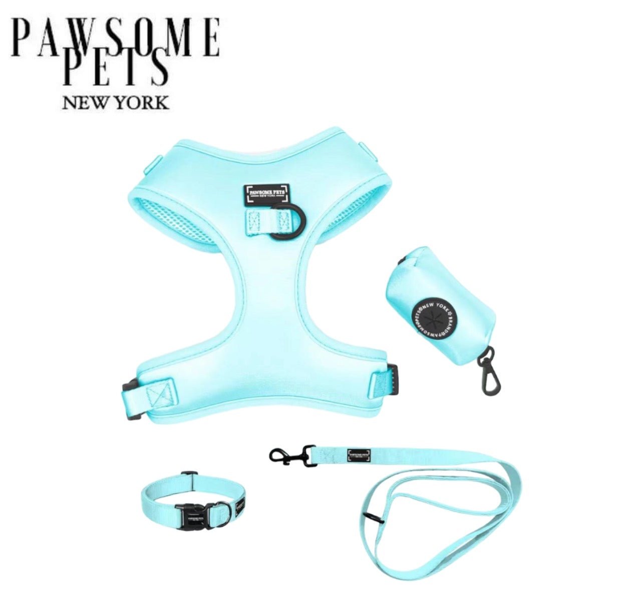 The set includes matching Harness,Waste Bag Holder,Leashes,Bowtie and Collar.