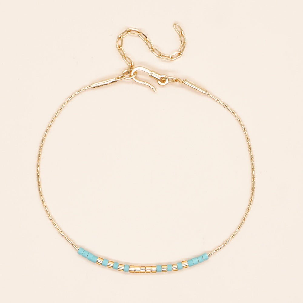 Delicate Gold double-strand bracelet made of a thin chain with a colorful beaded accent.