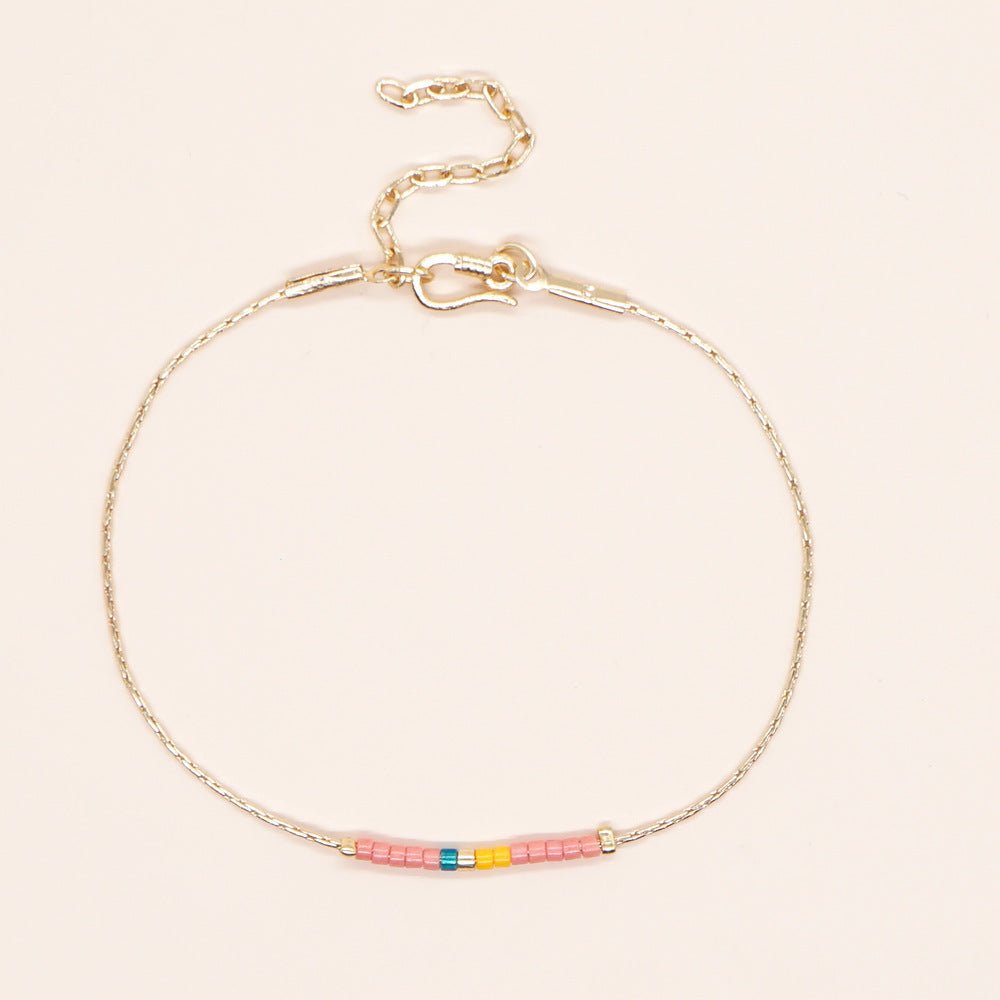 Delicate Gold double-strand bracelet made of a thin chain with a colorful beaded accent.