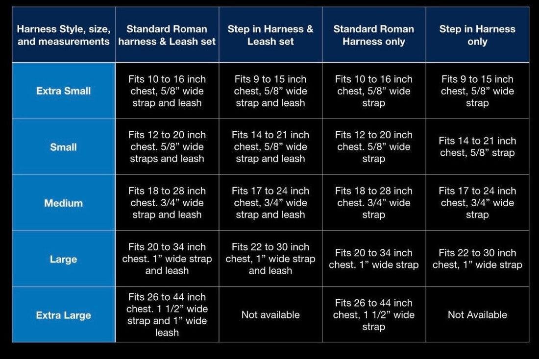 Extra Small fits 9′-15″ chest Girth – comes in 1/2” width strap – avg weight max 10 lbs full grown.